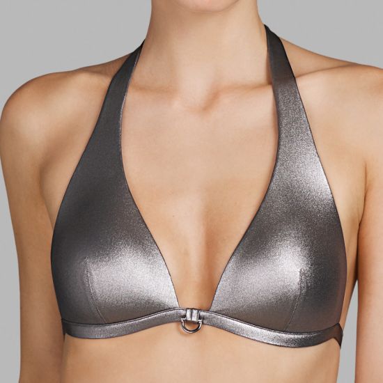 Triangle rembourré sans armatures noué au cou. Pour un beau décolleté. Les tissus métallisés sont hyper à la mode. En argenté avec détails dorés, c'est la version la plus chic de cette saison.